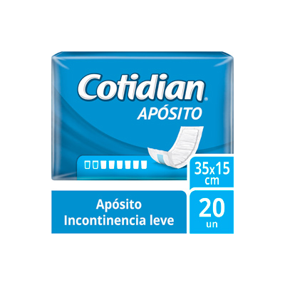 Apósito Cotidian incontinencia leve, talla única. Tamaño 35 x 15 cms. Formato: Envase 20 unidades.